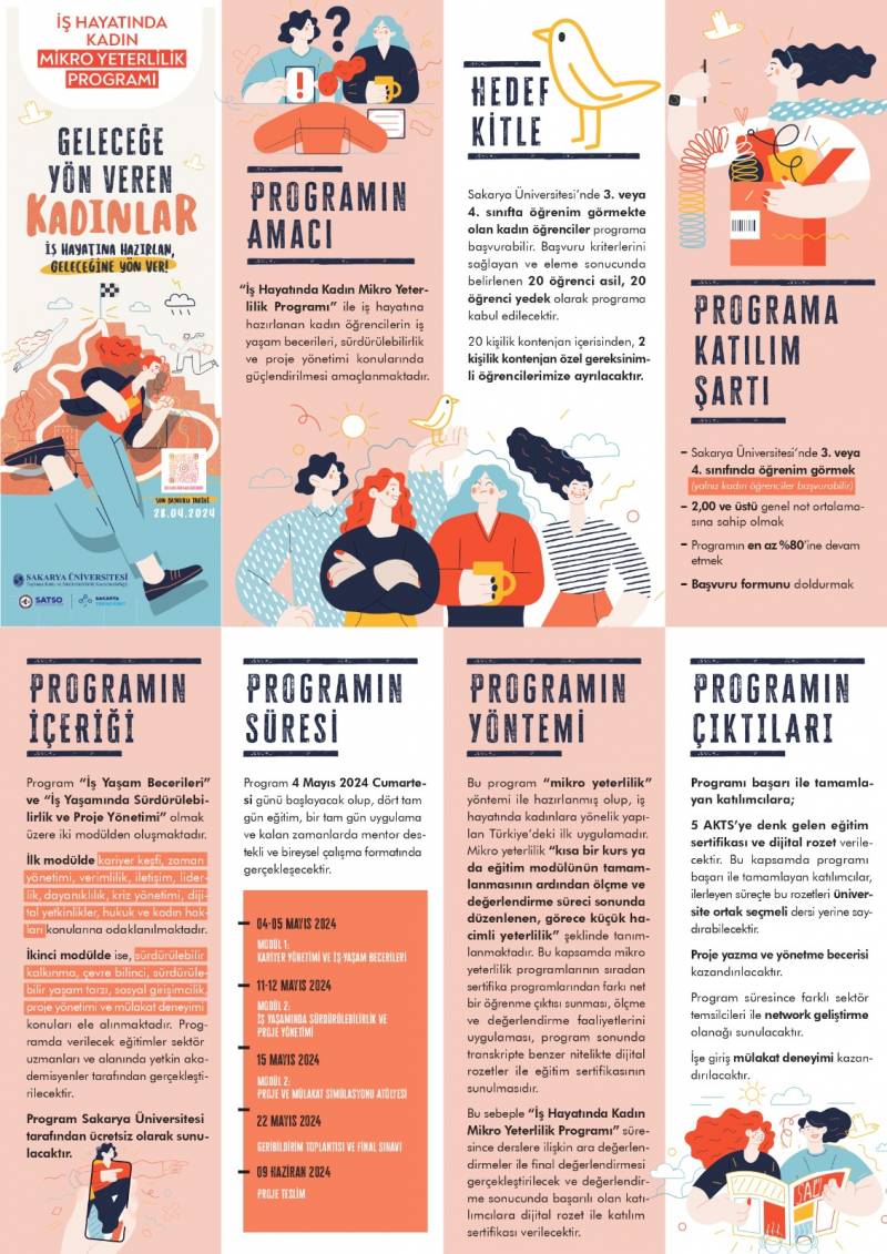 Sakarya Üniversitesi Topluma Katkı ve Sürdürülebilirlik Koordinatörlüğü ile Teknokent organizasyonu ve Sakarya Ticaret ve Sanayi Odasının destekleri ile Sakarya Üniversitesinde 3. veya 4. sınıfta öğrenim görmekte olan kadın öğrencilere yönelik "İş Hayatında Kadın Mikro Yeterlilik Programı" gerçekleştirilecektir.